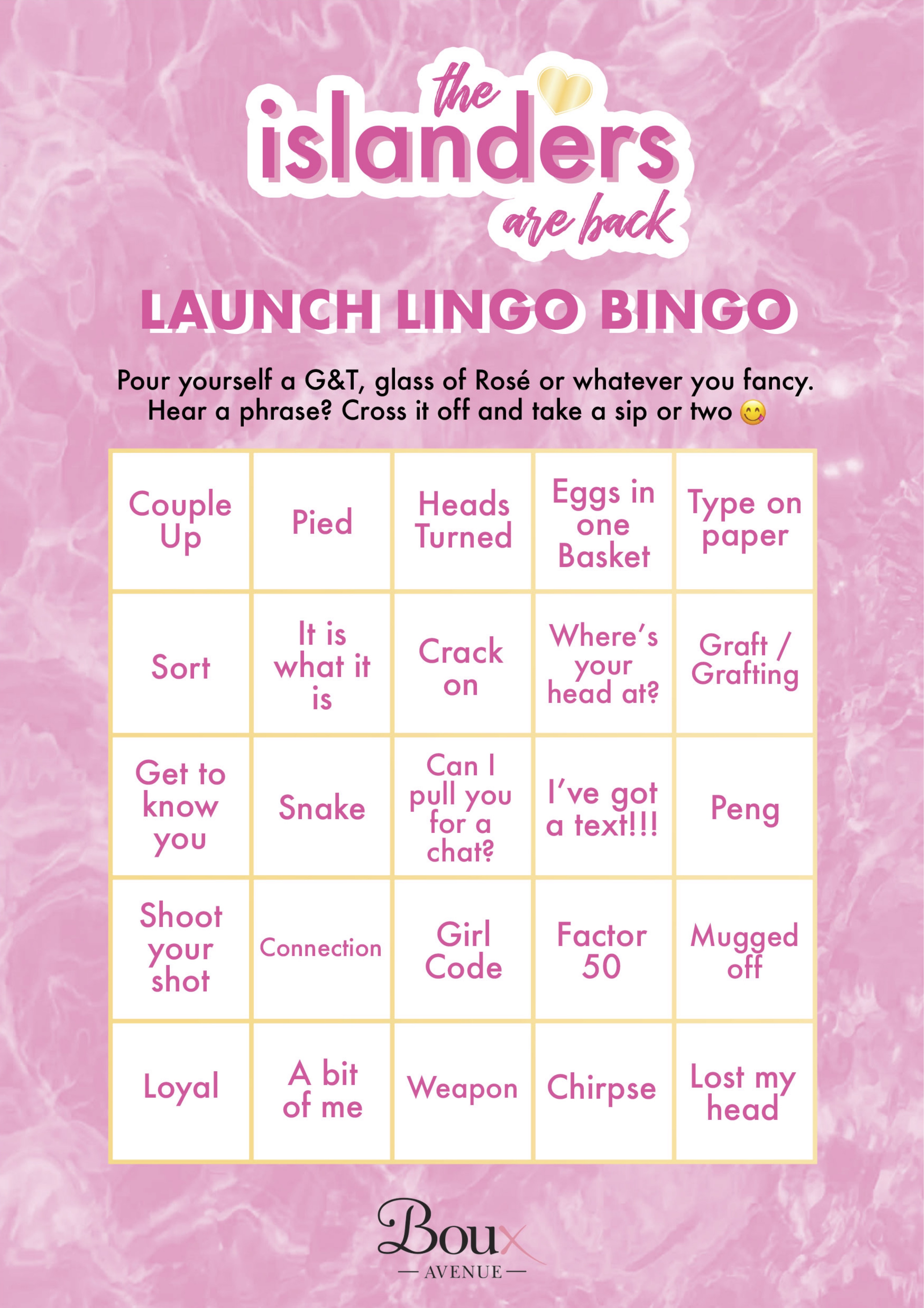 Love Island Launch Love Island Bingo Card Boux Avenue